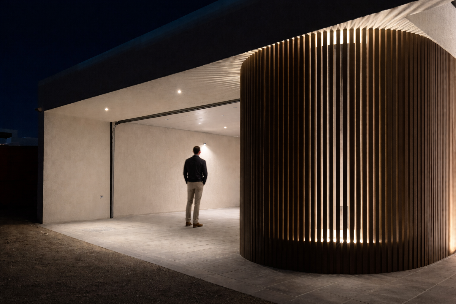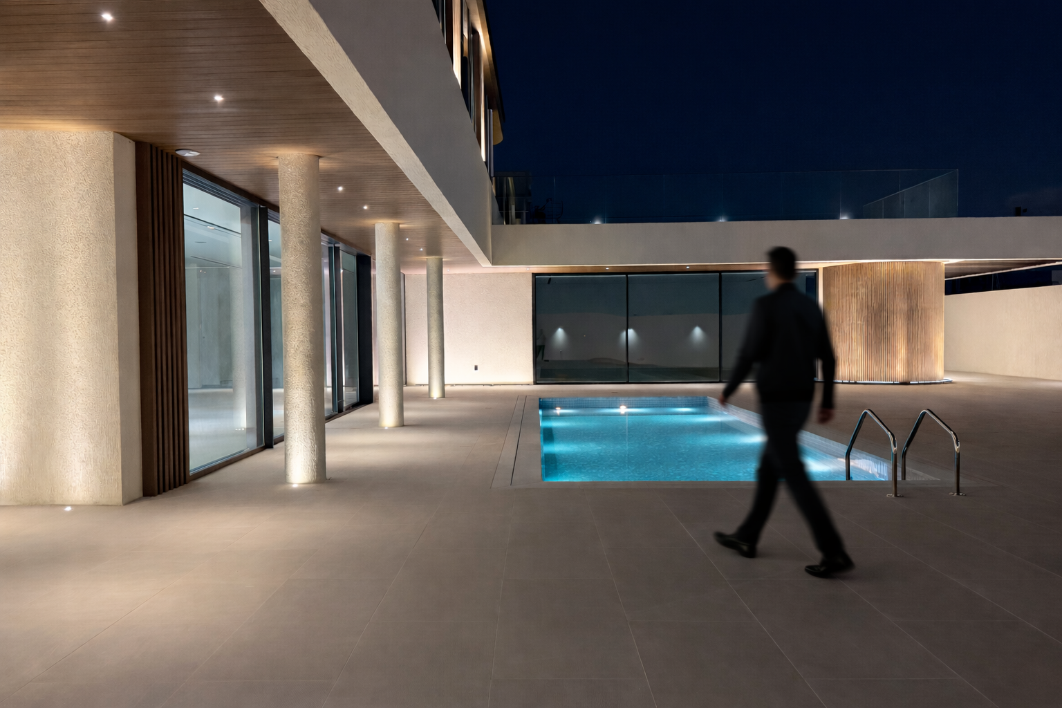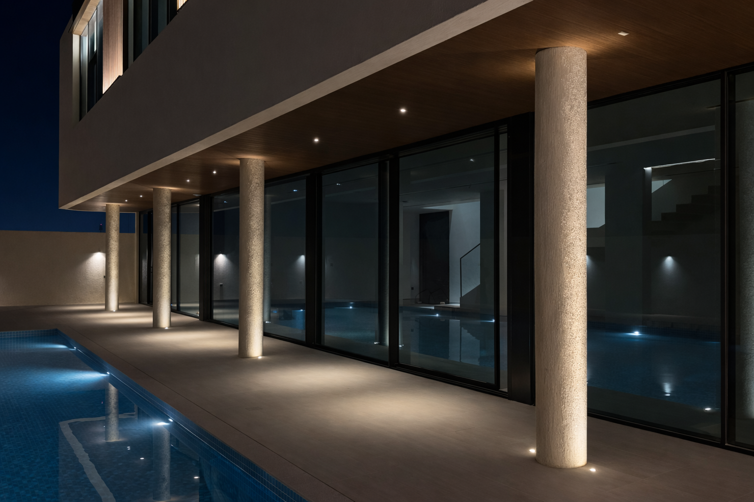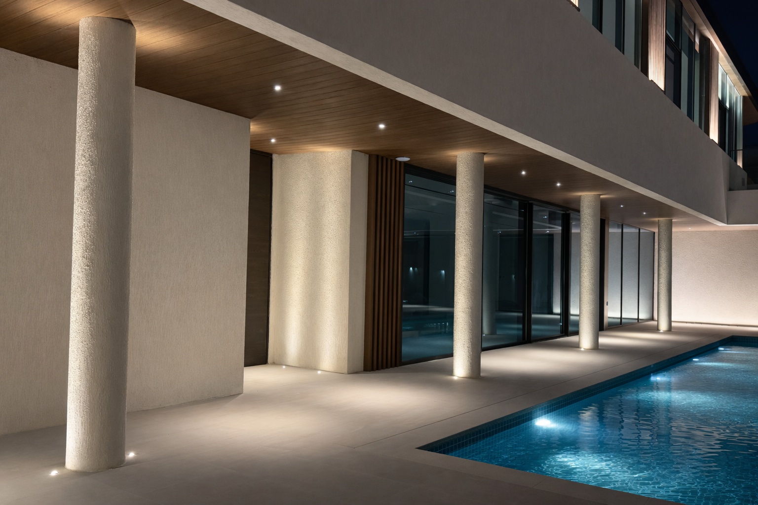 As dusk falls, this contemporary villa is transformed by a thoughtfully curated exterior lighting design that enhances its architectural identity. Discreet linear LED accents are integrated along edges and structural elements, subtly outlining the villa’s geometry and creating a refined visual rhythm. Carefully positioned uplights wash the façade with soft, even illumination, emphasizing materials and depth while maintaining visual comfort. The result is a balanced nighttime presenceelegant, modern, and inviting. More than just illumination, the lighting acts as an architectural feature, elevating the villa’s character and delivering a sophisticated statement ideal for luxury residential environments.