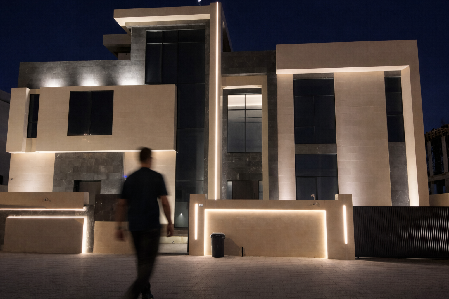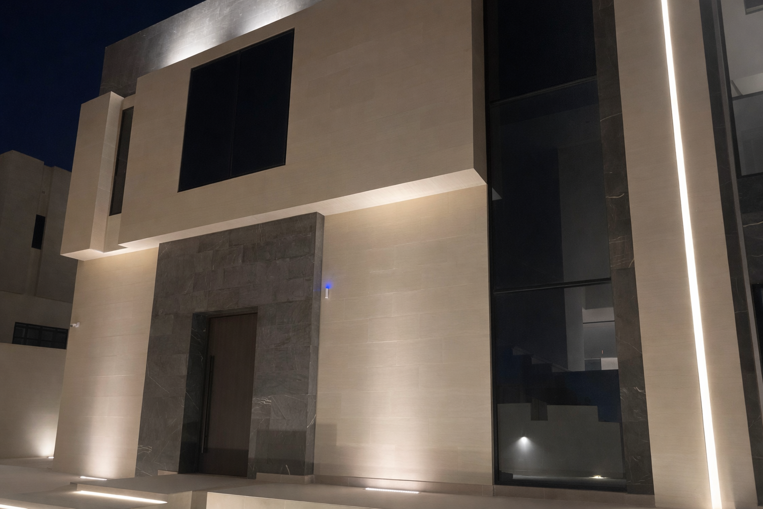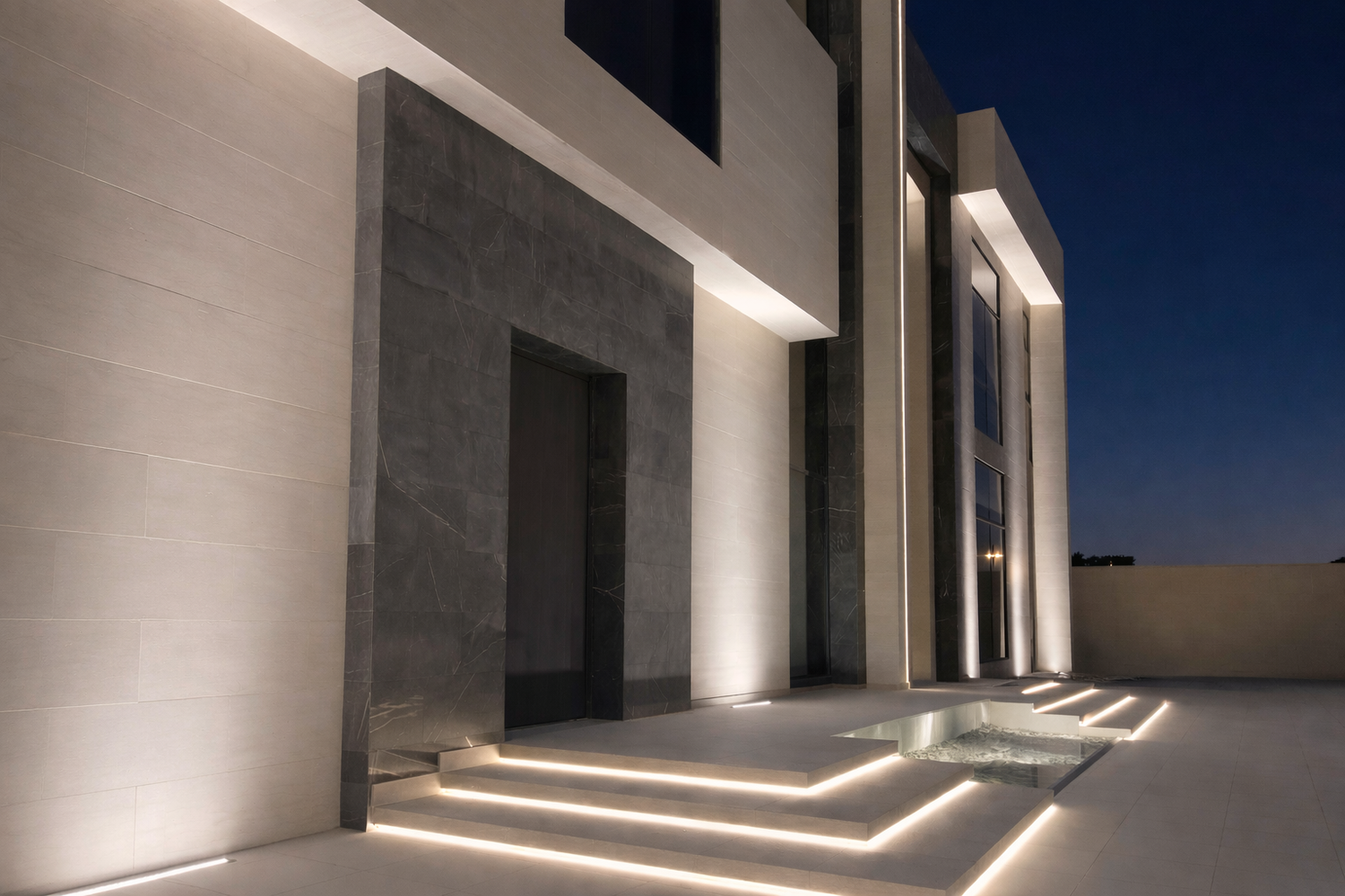 As evening sets in, this residence is brought to life through a refined exterior lighting concept that complements and elevates its architectural form. Clean linear light elements are seamlessly integrated into key lines and volumes, gently defining the structure and enhancing its contemporary character. Soft façade uplighting adds depth and texture, highlighting material finishes while preserving a calm and visually comfortable atmosphere. The overall composition creates a composed nighttime identity—warm, elegant, and understated—where lighting becomes an extension of the architecture, delivering a timeless and sophisticated presence suited for high-end residential living.