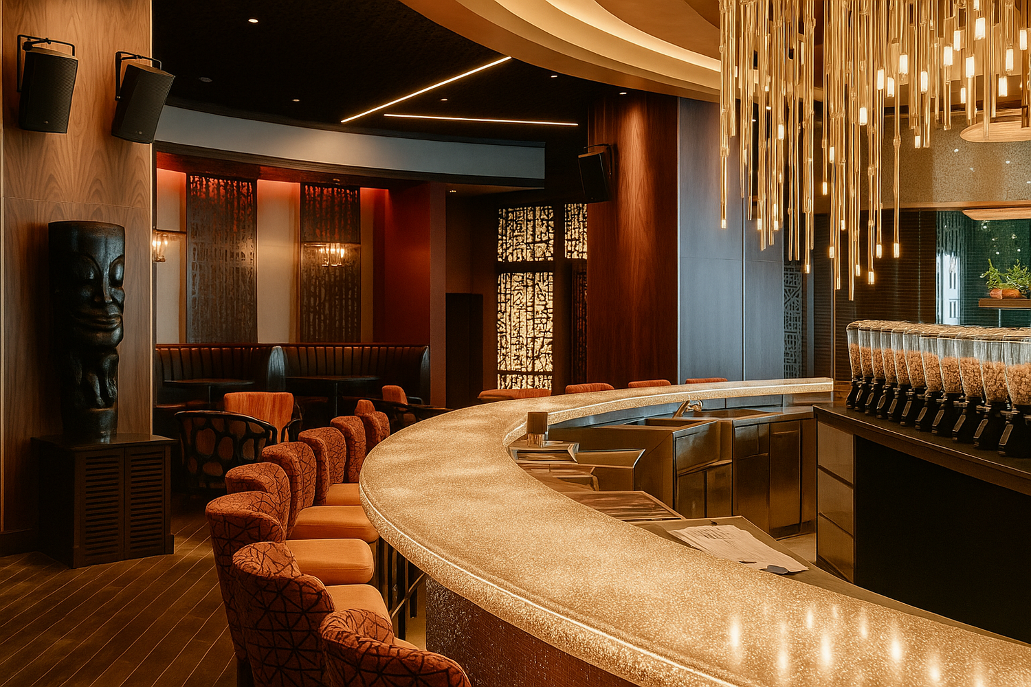 For Trader Vic’s on Palm Jumeirah in Dubai, UAE, we designed a lighting ambiance that enhances its signature tropical-inspired, island-style atmosphere. The illumination brings warmth and richness to the restaurant’s natural materials, textured décor, and vibrant thematic elements. By blending soft glows with carefully placed accents, the lighting creates an inviting, immersive environment that complements the venue’s lively character and elevates the overall dining experience.
