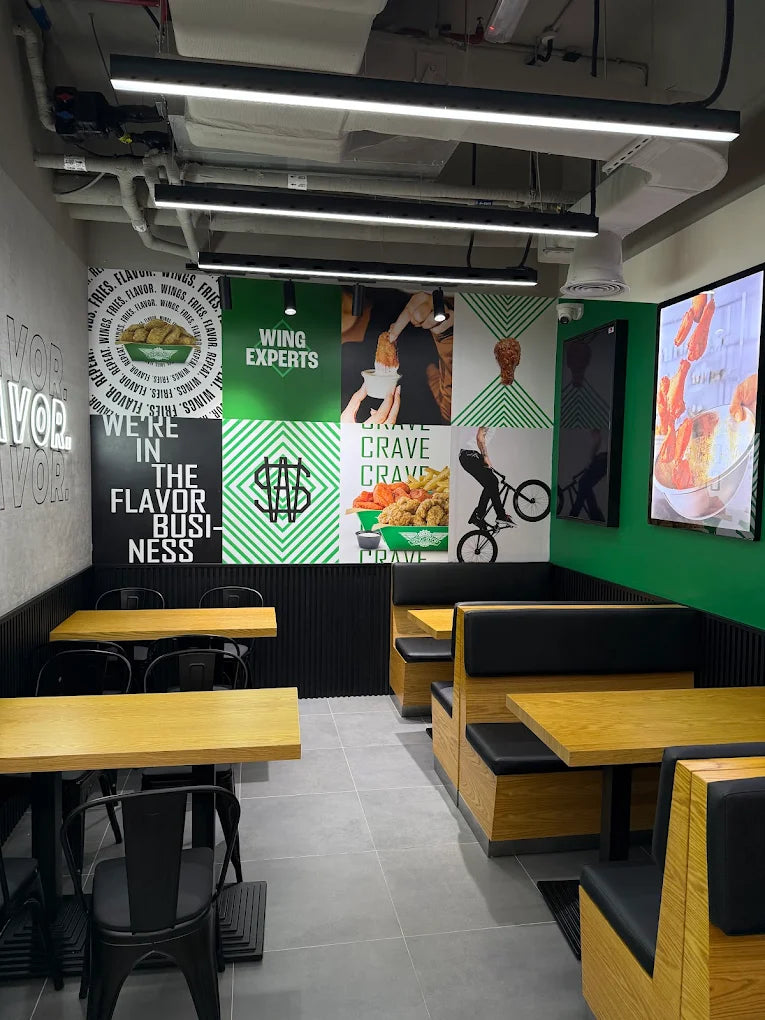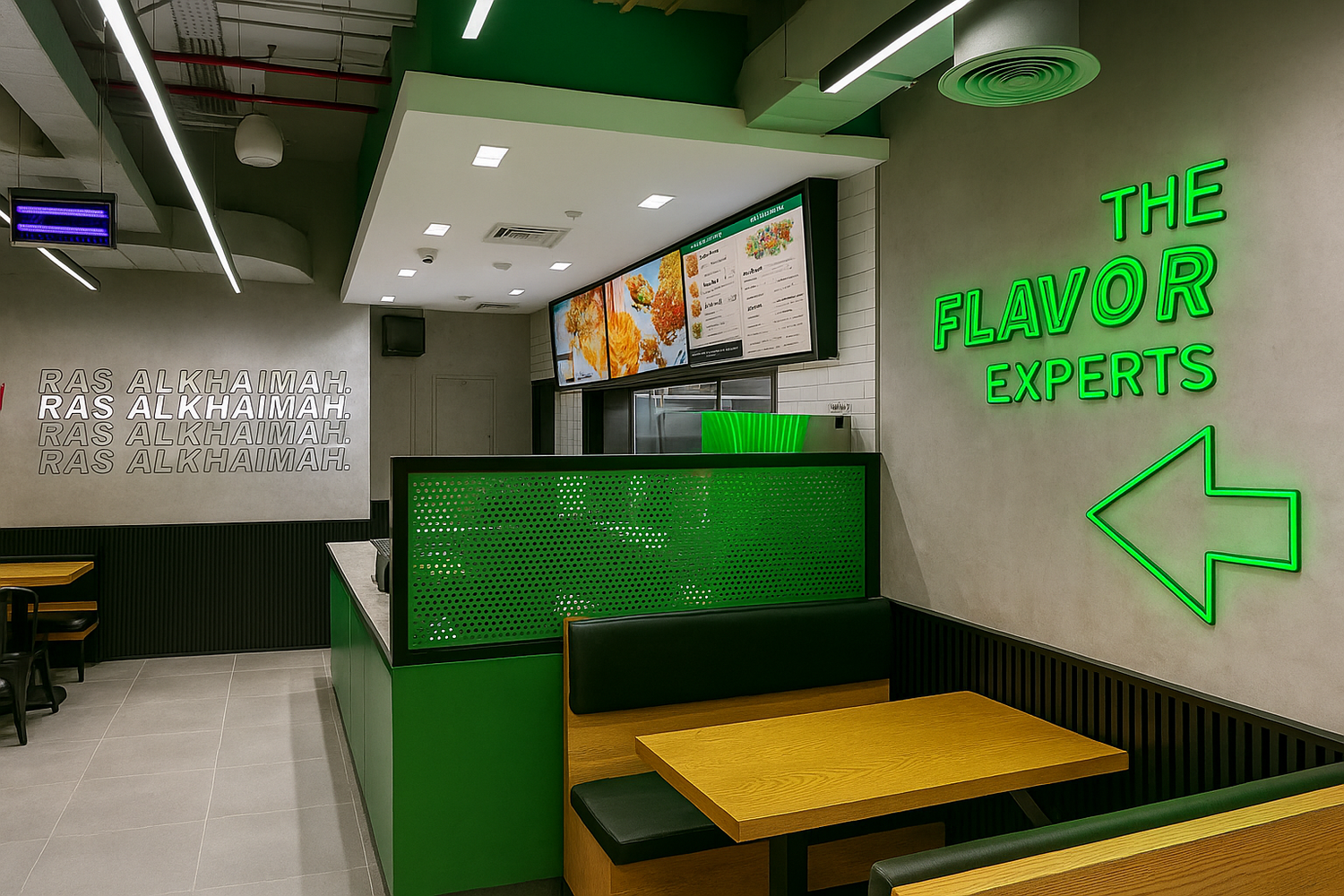 For Wingstop at Al Hamra Mall in Ras Al Khaimah, UAE, we created a lighting setup that complements the brand’s energetic and casual dining atmosphere. The illumination accentuates key interior features, enhances the vibrant color scheme, and ensures a comfortable visual experience for guests. With a balance of focused highlights and warm ambient tones, the space feels lively, welcoming, and aligned with Wingstop’s bold, modern identity.